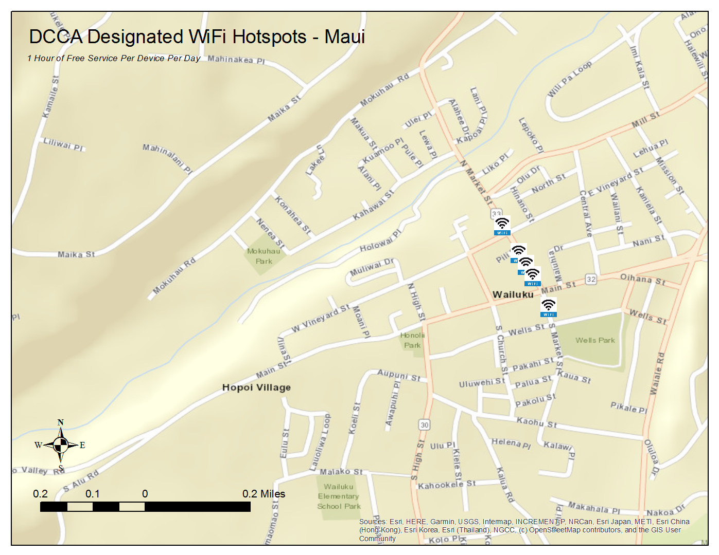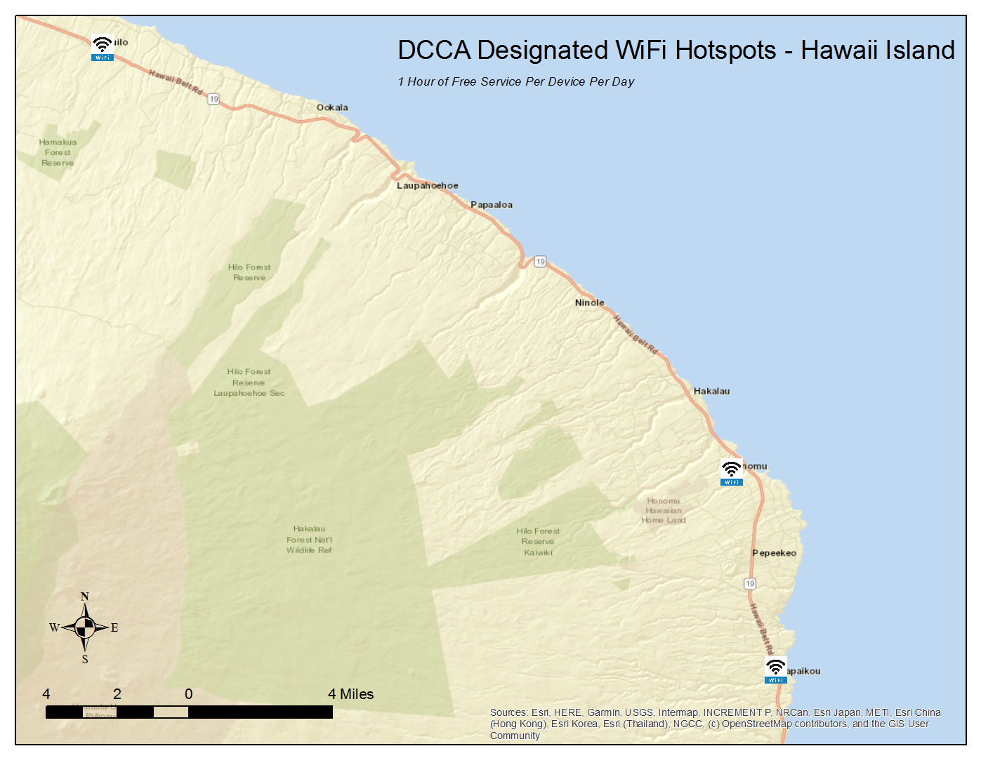 These designated locations offer 1 hour of free WiFi service per device per day. To locate these hotspots, scroll down for listings and maps by island or click on the link below to access an interactive version of the state map (locations are approximate):